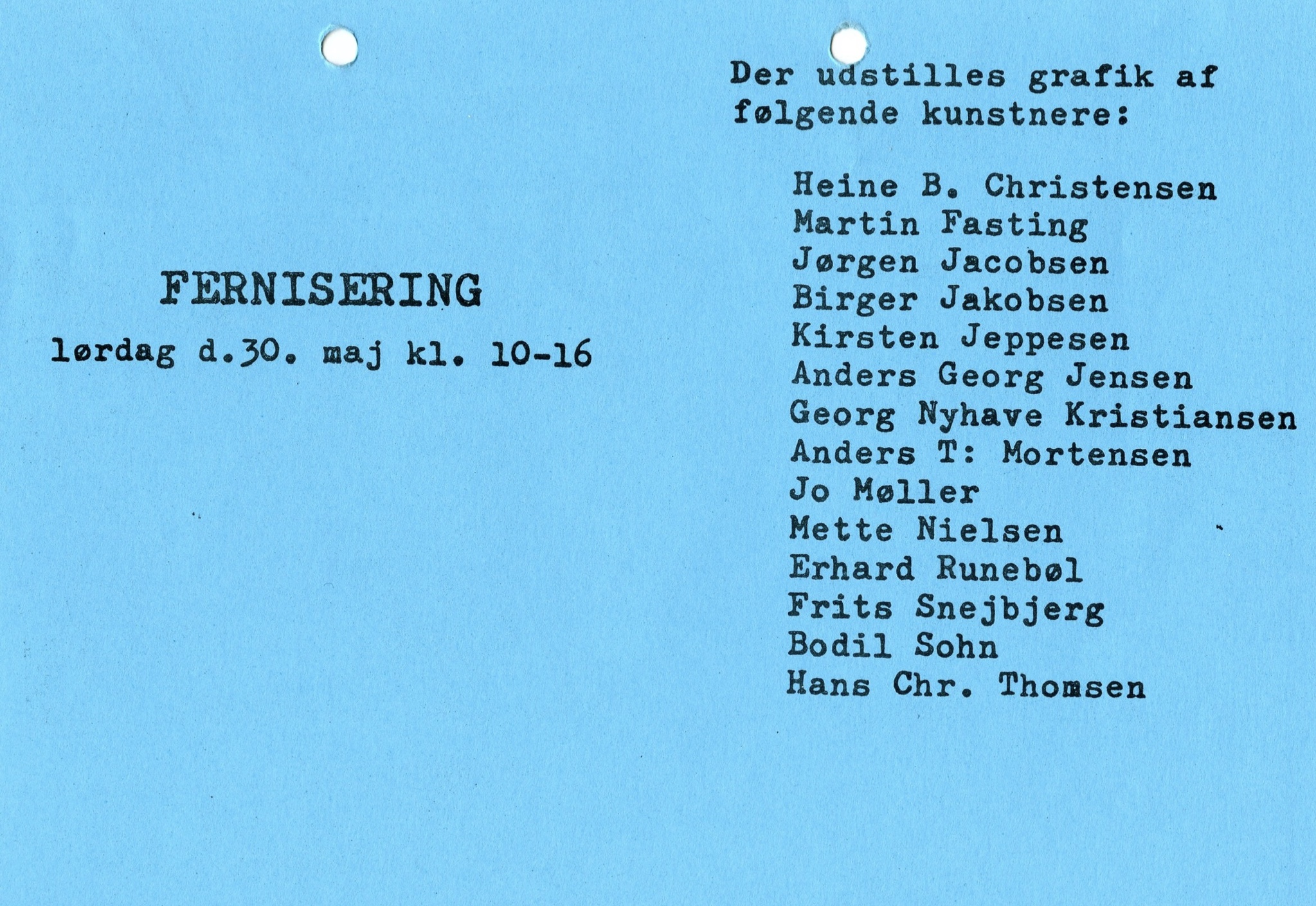Jo: Det mener jeg ikke, men Ryberg gjorde, det har jeg jo bevis for fra en plakat. Der var mange, Dea Trier Mørk, Herup osv. … Om Jørgen Jacobsen var med i noget. Det er svært at huske. Han var muligvis med i noget. Nyholm bakkede også op om det. Ham kendte jeg jo ude fra Hørbylunde, men han udstillede nok ikke. De skulle jo passe på nogle af dem, fordi vi var et alternativ til Galleri Moderne, det kaldte vi os. Så var der ligesom lagt en linje [griner]. Så har man stukket næsen lidt frem. Der var nogen som var nervøse for – hvis de havde noget med os at gøre – om de så kunne falde i unåde omme i Galleri Moderne. Men da vi havde været der et par år blev vi inviteret med til ferniseringerne på Galleri Moderne, så var vi accepteret. Så det var fint nok. Det tager sin tid.