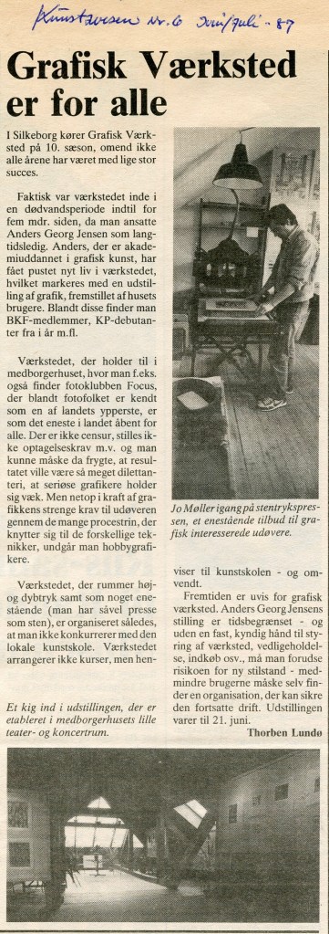 Jo: Ja på det tidspunkt er vi flyttet fra Bindslevs Plads til Lysbrogade, hvor vi købte et hus. Og i den mellemliggende periode havde jeg været meget optaget af teater og arbejdet med det. Jeg tror det er efter at Mollio Masketeater, som det hed, stoppede. Vi var blevet lovet en masse penge fra Kommunen, som vi ikke fik alligevel og så gik bunden ud af økonomien. Så var det det. Og der begyndte jeg så at male igen og tænkte at, ok, så er det det jeg koncentrerer mig om. Og så begyndte det for alvor med Grafisk Værksted. Jeg skal lige se her … [kigger i nogle papirer]. Ja det passer meget godt fordi jeg underviste også på Herning Højskole, også i teater, masker, bevægelse og billedkunst selvfølgelig. Og der sagde jeg op i 1983 og så startede vi teatergruppen, og den slutter omkring ‘86. Så det er først derefter at jeg kommer derind. Jeg snakker med Anders Georg og han tilbyder mig at komme op og arbejde på værkstedet. Det er så det første jeg kan se her … jeg sidder her med den her artikel fra Kunstavisen. Og den er fra ‘87. Vi siger ‘86 / ’87. Det er først der jeg går i gang med at lave de der tryk, hvor vi arbejder på nogle meget fine sten.