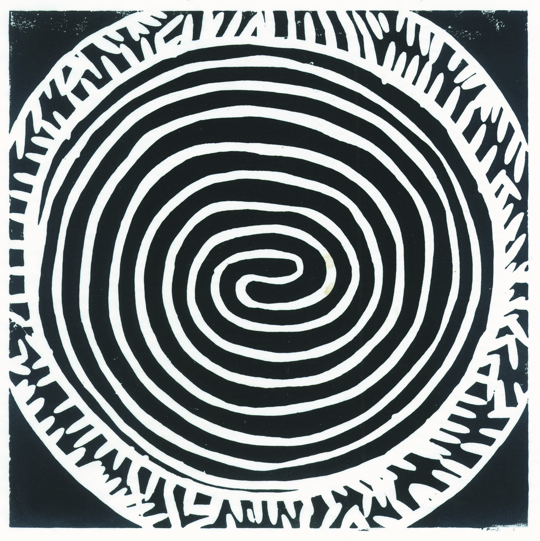Jo: Det hænger jo sammen. Det er jo det. Du kan se på den opslagstavle her. Dobbeltspiralen. Det er jo det det handler om. Altså der var en der fortalte mig at hun kørte kurser og bad alle eleverne om at lave en spiral. Og nogen starter spiralen indefra og nogen starter en spiral udefra. Men det der er det interessante, det var det jeg snakkede med hende om, det er dobbeltspiralen. Fordi den går begge veje, som åndedrættet. Du trækker vejret ind og du puster vejret ud. Det stopper ikke. Det er ikke noget der forsvinder ind i ingenting eller ud i ingenting. Det er et kredsløb. Du har et forløb, som du kan gentage og gentage. Og den er jo ikke særlig stram i kompositionen, den der. Den er inspireret af nogle klippeformationer nede på den ø, der hedder La Palme. Hvor det var hugget ind i klipperne på en lille stump klippeø, det var ikke en lavaø, en klippeø, hvor jeg så det første gang og tænkte, “Det der er et ursymbol”.